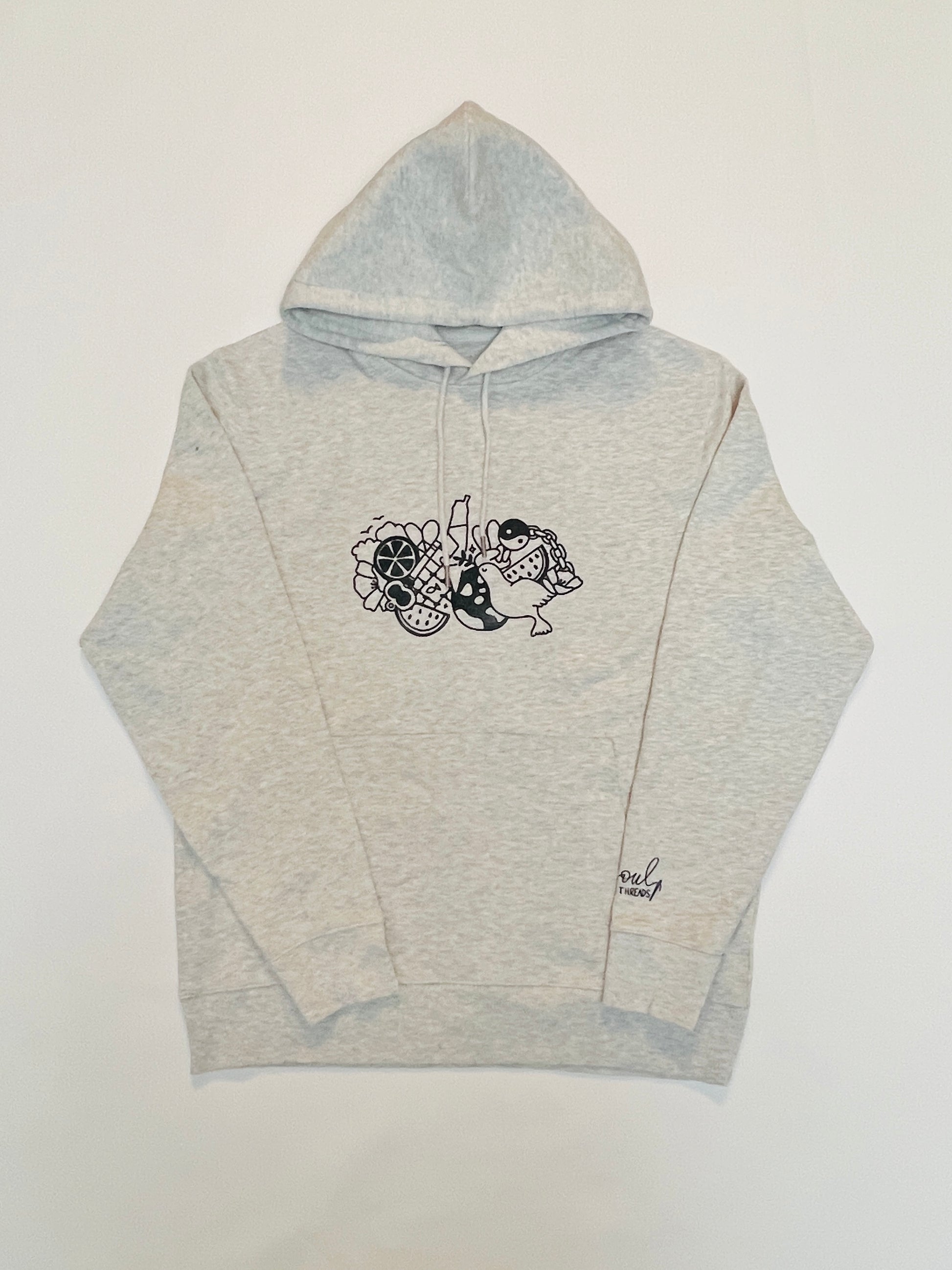 The Peace Doodles Hoodie features a soft grey base with a detailed doodle-style design on the back.